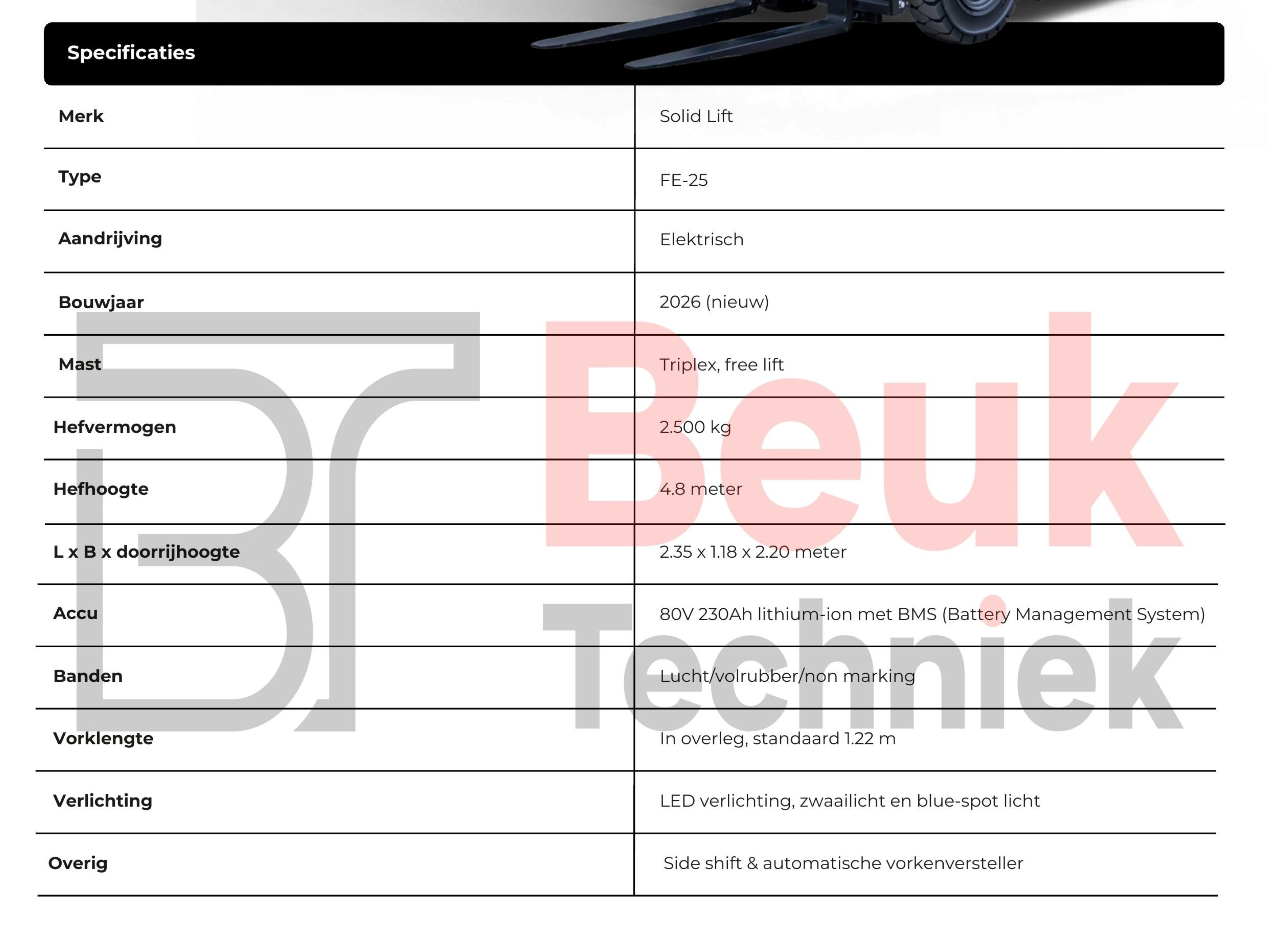 De FE-25 verplaatst lasten tot 2.500 kg veilig en stabiel. De krachtige elektrische aandrijving met lithium-accu levert betrouwbare prestaties bij dagelijks gebruik.