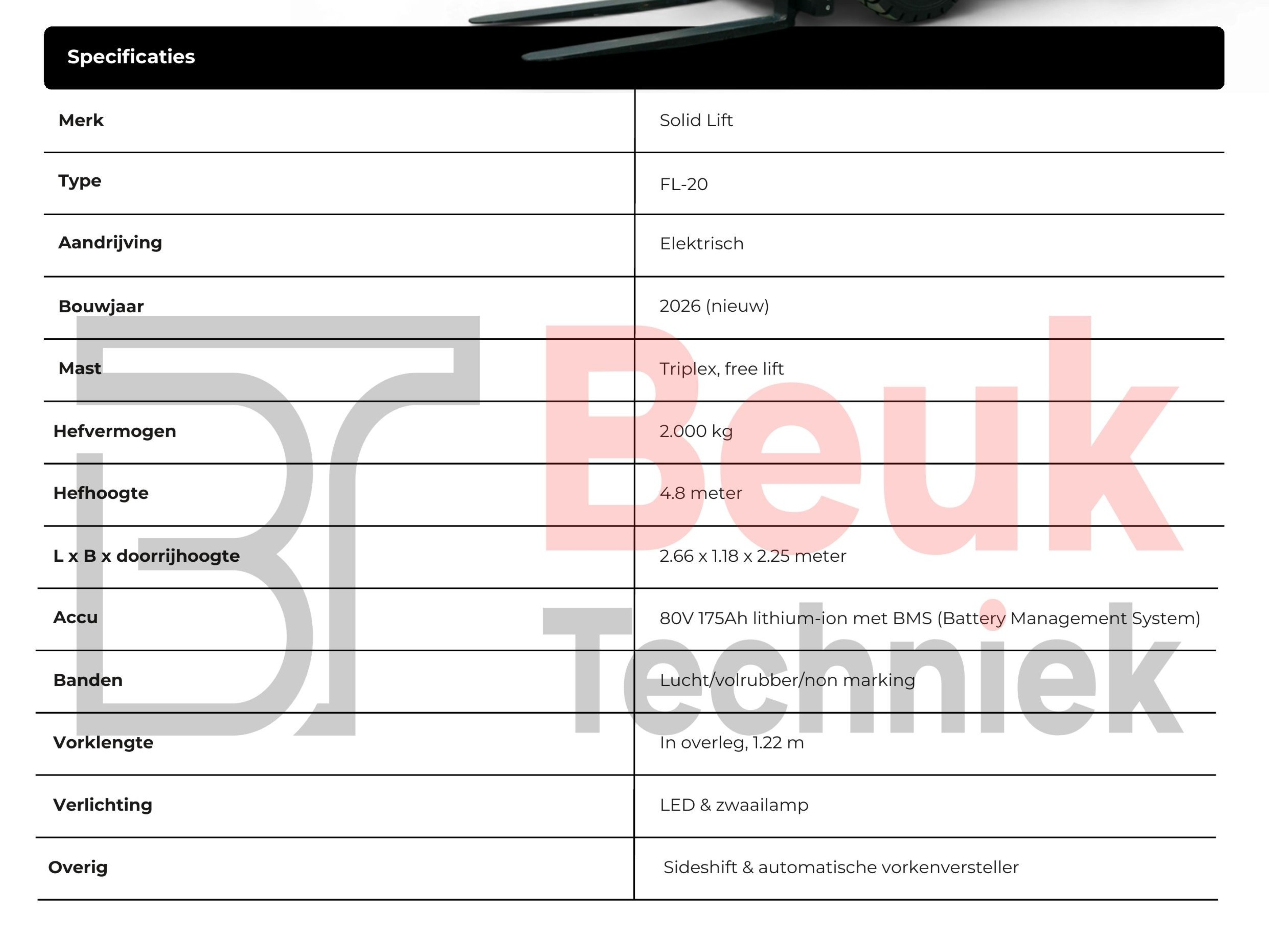 Met een hefvermogen van 2.000 kg en een robuust, stabiel chassis vormt de FL-20 de ideale oplossing voor magazijnen, productieruimtes en buitentoepassingen.