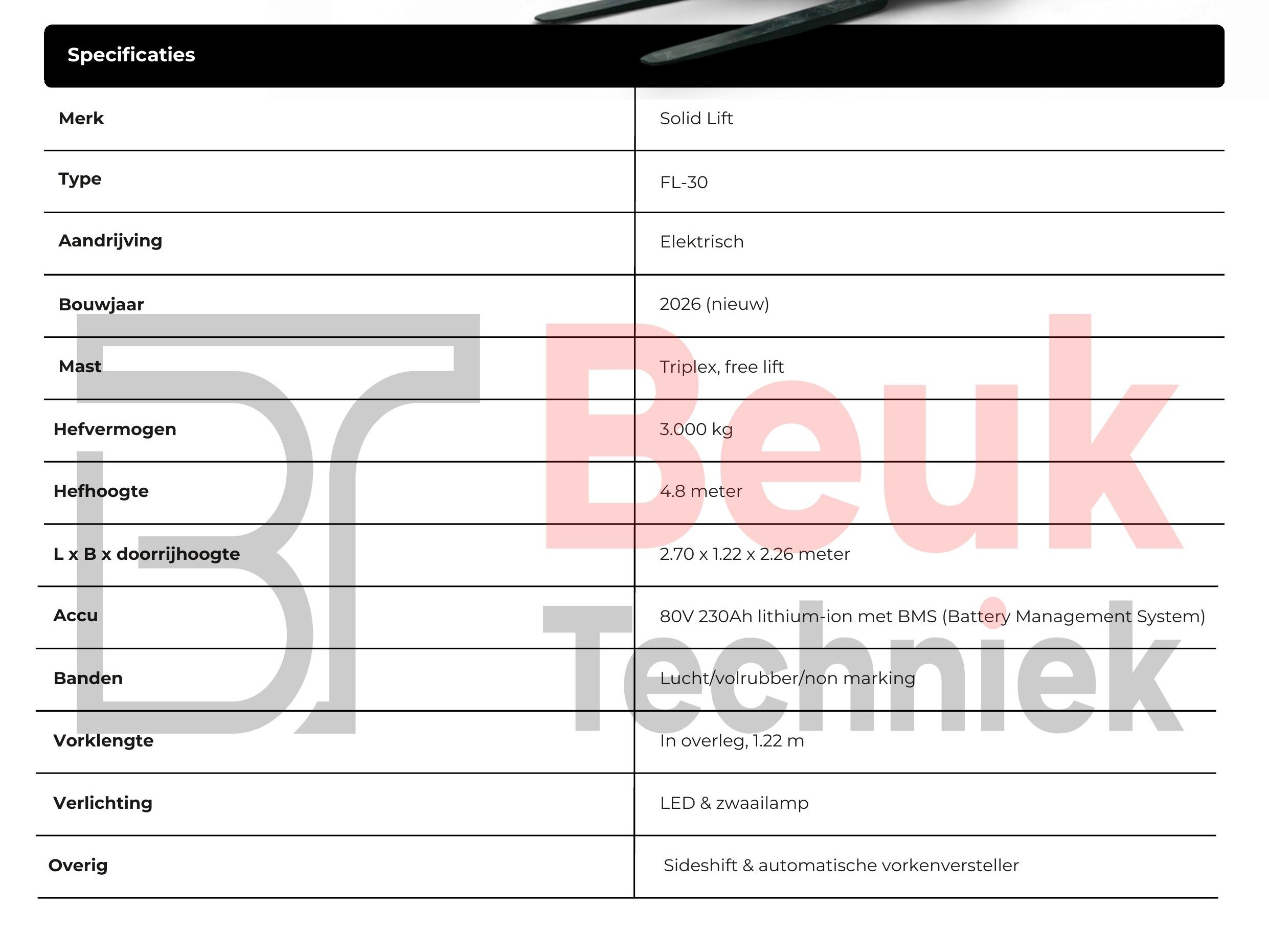 De FL-30 van Solid Lift is een elektrische vierwielheftruck met een hefvermogen van 3.000 kg, ontworpen voor intensief dagelijks gebruik. Dankzij het robuuste chassis en de moderne lithium-ion technologie levert hij maximale prestaties, volledig emissievrij.